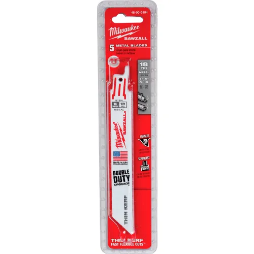 PART NO. MET48005184 Milwaukee 48-00-5184, Sawzall Reciprocating Saw Blade, 6 x 3/4 x 0.035", 18TPI, 5 Blades/Pkg