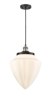 INNOVATIONS 201C-BAB-G661-12-LED 1-Light Mini Pendant Black Antique Brass. Collection: Franklin Restoration. Style: Traditional, Art Deco. Metal Finish: Black Antique Brass. Metal Finish (Canopy/Backplate): Black Antique Brass. Material: Steel, Cast Brass, Glass. Dimension(in): 16.5(H) x 12(W) x 12(Dia). Min/Max Height (Fixture Height with Cord or Included Stems & Canopy)(in): 19.5/136.5. Wire/Cord: 10 Feet Of Black Textured Cord. Bulb: (1)6W Medium Base,Dimmable(Not Included). Maximum Wattage Per Socket: 100. Voltage: 120. Color Temperature (Kelvin): 2700. CRI: 82. Lumens: 600. Glass Shade Description: Matte White Cased Large Bullet. Glass or Metal Shade Color: Matte White. Shade Material: Glass. Glass Type: Frosted. Shade Shape: Schoolhouse. Shade Dimension(in): 12(W) x 13(H). Fitter Measurement (Glass Or Metal Shade Fitter Size): 3.25 inch Fitter. Canopy Dimension(in): 4.5(Dia) x 0.75(H). Sloped Ceiling Compatible: Yes. California Proposition 65 Warning Required: Yes. UL & ETL Certification: Damp Location.
