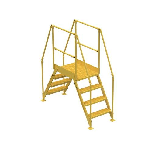 The Cross-Over Ladder mounts where you need permanent access at crossover points. The upper platform features removable two sided handrail with mid-rail and fixed toeboards to prevent objects from rolling off. Serrated steps for extra grip and safety. Ground legs include floor mounting pads. Unit must be anchored to the floor. Cross-Over Ladder is all welded steel construction but can be knocked-down for storage and shipping. Powder coat yellow finish. Limited Warranty: 90 days. Uniform Capacity (pounds): 500, Platform Height (in.): 40, Platform Width (in.): 23-1/2, Platform Length (in.): 48, Handrail Height (in.): 42-5/8, Mid-Rail (in.): 21, Toeboard (in.): 4, Step Width (in.)