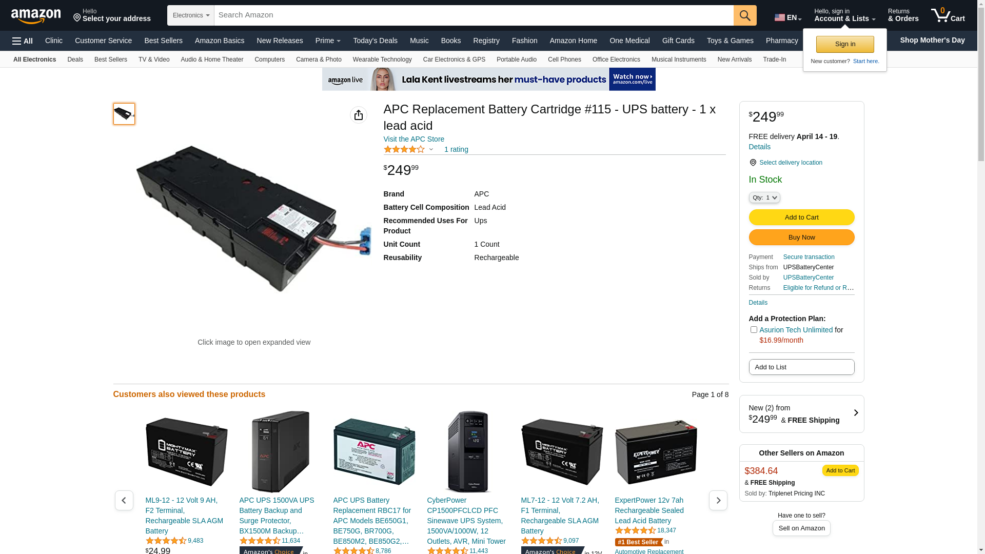 | gordonelectricsupply.com | APCRBC115 | 1 | Available | 1 | 1 @ $369.00 |