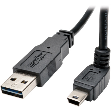 Tripp Lite's <strong>UR030-003-DNB</strong>, 3-ft, USB 2.0 Universal / Reversible "A" to Down-Angle Mini-B 5-pin device cable, meets or exceeds USB 2.0 Specifications. Connects a Digital camera, PDA, Cell Phone, and more, to a USB port on a computer or hub. Backward compatible - can be used with older USB1.1 applications as well. All Tripp Lite USB 2.0 cabling include superior foil shielding for reliable, error-free data communications. Features nickel plated connectors and gold plated copper contacts for superior conductivity. The cable is manufactured with molded connectors and integral strain relief for extra durability and long life.</p>