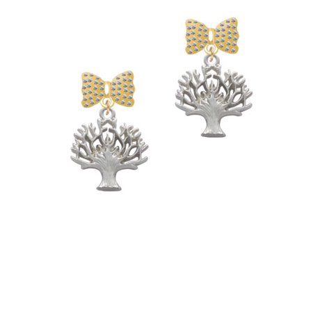 Silver Tone Tree of Life Gold Tone Bella Bow Crystal Earrings. Silver Tone, hand enameled charms. Charm size is approx. 0.84 x 0.75 x 0.13 inches (HxWxD) including loop. Bella Bow Earrings are approx. 11 x 13 x 3 mm (HxWxD). Bella Bow Earrings come with steel post and friction back. Many believe bows signify femininity and love. Bows can also signify specialty as they have been used to embellish gifts which we give to our loved ones. Bows are associated with the joy of giving and sharing. Featured item is an exclusive Delight & Co. design. We are a family owned company for over 35 years in the U.S.A. PLEASE NOTE: Our products are lead safe, but are not intended for children 14 years and younger.