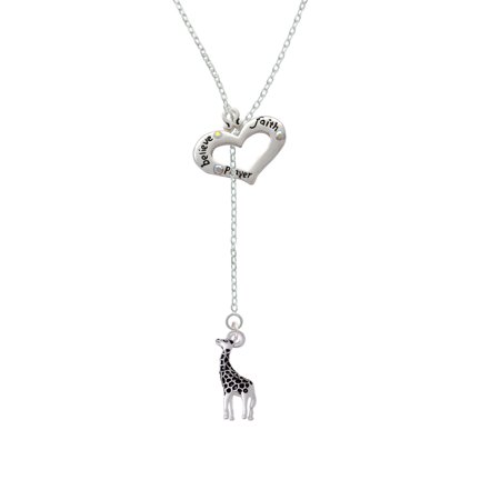 Silver Tone Antiqued Giraffe - Believe - Faith - Prayer - Open Heart with Crystals Lariat Necklace. Silver Tone Antiqued Giraffe charm is approx. 0.78 x 0.32 x 0.18 inches (HxWxD) not including loop. Antiqued giraffe is 3-D. Necklace is adjustable from 18 to 20 inches. Necklace comes with lobster claw clasp and 2 inch extender chain. Featured necklace is an exclusive Delight & Co. design. We are a family owned company for over 35 years in the U.S.A. PLEASE NOTE: Our products are lead safe, but are not intended for children 14 years and younger.