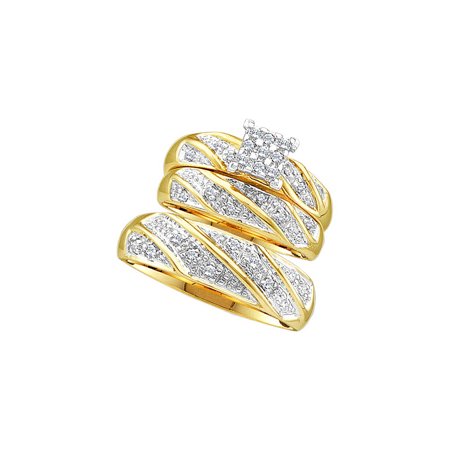 <p><span style="font-size:16px;"><b><u>Description</u></b><br /></span></p> <p><span style="font-size: 14px;">14kt Yellow Gold His & Hers Round Diamond Cluster Matching Bridal Wedding Ring Band Set 1/4 Cttw</span></p> <br /> <p><span style="font-size:16px"><u><b>Gemstone Details</b></u></span></p> <p><span style="font-size:14px">1/4 Carats total weight<br /><br />All diamonds are natural and conflict-free in origin<br /><br /></span></p> <ul type="square"> <b>Round Diamond</b> <br /> <li>1/10 ct.t.w.</li> <li>I2-I3 clarity</li> <li>J-K color</li> <li>Cluster setting</li> </ul> <br /> <ul> <b>Round Diamond</b> <br /> <li>1/6 ct.t.w.</li> <li>I2-I3 clarity</li> <li>J-K color</li> <li>Prong setting</li> </ul> <br /> <p><span style="font-size:16px"><u><b>Specifications</b></u><br /></span></p> <p><span style="font-size:14px">14kt Yellow Gold<br />Widest point width: 3.5 mm (.14 inches )<br />Width of shank: 4 mm<br />5.64 grams (approximately)<br />Ring size selectable</span></p> <p><span style="font-size:11px">Combined diamond weight of 1/4 carats total weight represents a range of 0.23 - 0.29 cts. t.w.</span></p>