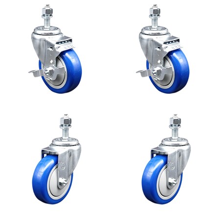 4 Inch SS Blue Polyurethane Swivel Inch Threaded Stem Caster Brakes SCC, 2PK