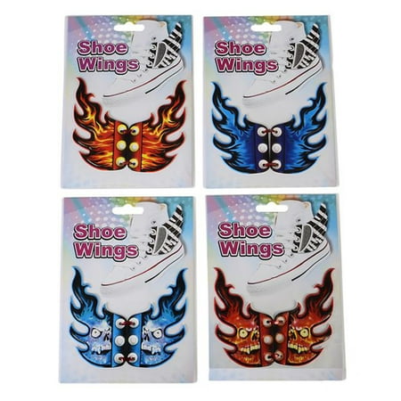 Put some style in your footwear with these attractive flame and skull shoe wings! Lace these up and let them fly with you walk, jog, or run around all day. Popularized and inspired by Shwings, these come in a variety pack of red and blue flames and skulls that are sure to catch anyone's eye. These are great on their own, but are even better with the other costumes and accessories available in our store!