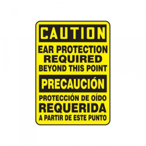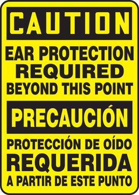 Bilingual OSHA Safety Signs (English & Spanish) - CAUTION: Ear Protection Required Beyond This Point, 14" x 10". Versatile, Stick-nearly-anywhere vinyl sign and with UV protection. Adhesive Dura-Vinyl is a custom sign material with dual-layered vinyl that outperforms standard vinyl. Printed image is protected by a high-gloss, 1-mil, UV-resistant polyester over-laminate. Guaranteed for 5 years.<br><br>Flexible poly-composite material with UV protective laminate is resistant to abrasions, humidity, chemicals, solvents, and fading from sunlight. Permanent, acrylic adhesive back with peel-off liner adheres to smooth, curved, and irregular surfaces. <br>Service temperature range is -40 to 176F.