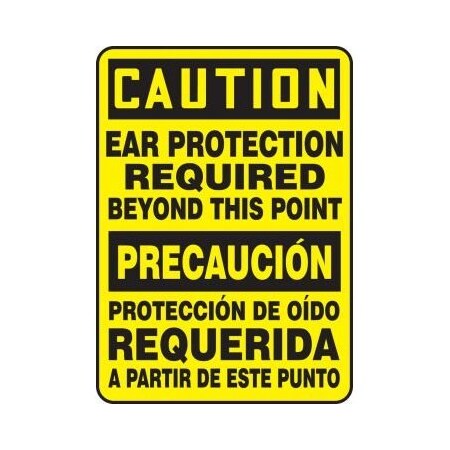 Bilingual OSHA Caution Safety Sign: Ear Protection Required Beyond This Point, Adhesive Dura-Vinyl, 14" x 10"