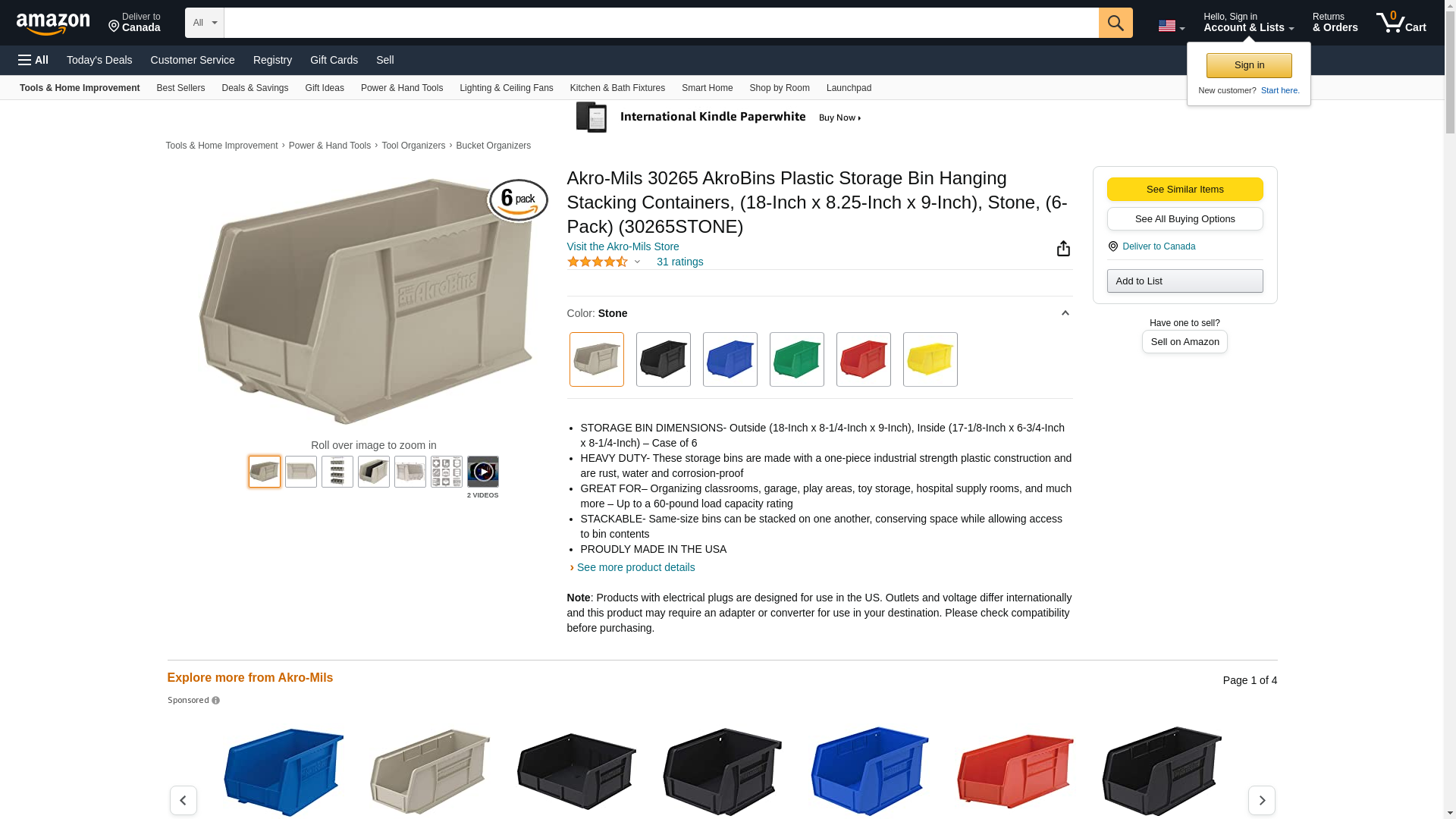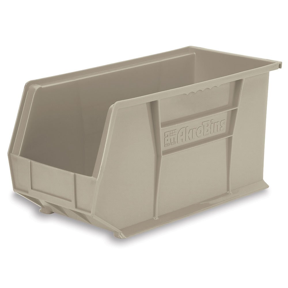AKRO-MILS AkroBins - 8-1/4x18x9" - StoneVersatile bins stack on one another, hang from louvered panels, or fit on your shelf for optimum storage. Guaranteed not to breakOne-piece construction includes side ribs that increase strength and enhance stackabilityFull-width hanger lipMolded-in slots for labelsCorrosion-proof; unaffected by acids or alkalisAutoclavable up to 250 degrees FDividers sold separately