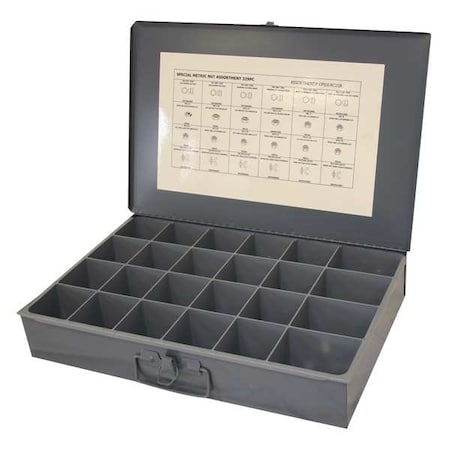 Nut Assortment, Includes Washers No, Largest Thread Size M12-1.75, Lock Type Nylon Insert, Number of Nuts 338, Number of Thread Sizes 24, Number of Washers 0, Nut Finish Zinc Plated, Nut Material Steel, Nut Type Hex Lock Nut, Smallest Thread Size M5-0.80, Standards DIN 1587, DIN 315, DIN 439B, DIN 985, System of Measurement Metric, Thread Sizes M10-1.50, M12-1.75, M16-2.00, M4-0.70, M5-0.80, M6-1.00, M7-1.00, M8-1.25