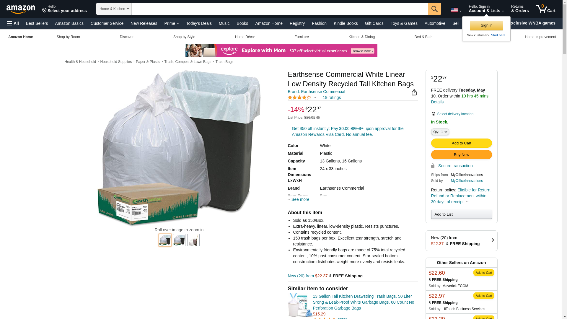 Earthsense Rnw1k150v Recycled Tall Kitchen Bags, 13-16Gal, 8Mil, 24 X 33, White, 150 Bags/Box