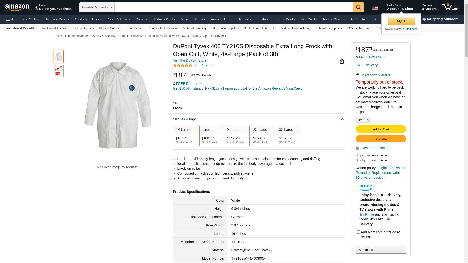 Dupont TY210SWH4X003000 White Tyvek Frocks with Collar, Open Wrists, Front Snap Closure, Serged Seams, 4X-Large (Pack of 30)