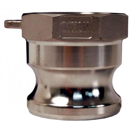 WARNING : Under no circumstances should cam and groove couplings be used for compressed air or steam service.<br><br>Dixon Cam and Groove Global Type A Adapters are Male Cam Adapter x Female NPT fittings for transitioning to a camlock connection. These Type A camlock fittings are available from 1/2" up to 4" in A380 Permanent Mold Aluminum or 316 Investment Cast Stainless Steel.<br><br>Dixon camlock fittings are all precision machined to rigid tolerances and designed to be interchangeable with all products produced to Commercial Item Description A-A-59326B. However, no standard exists for the 1/2" and 8" fittings and generally these will not interchange with other manufacturers. All couplers, regardless of casting material, utilize durable stainless steel cam arm pins that will not rust or bind. The couplers also feature a recess to hold the gasket firmly in place, ensuring proper placement and eliminating any chance for leakage.<br><br>Cam and Groove fittings are designed for use as a hose coupling that allows quick connect capabilities to increase operator productivity. To secure a connection, simply slide the adapter into the coupler, and with normal hand pressure press the cam levers down. Uncoupling is just as simple, just lift the cam arms and remove the adapter. Dixon also offers Dust Plugs and Dust Caps to keep hoses and process tubes clean while fittings are disconnected.<br><br>Dixon Cam and Groove Fittings Features:<br><br>- Precision Machined<br>- Rigid Tolerances<br>- Recessed Gasket Slots<br>- Buna N Seal Standard (alternates available)<br>- Stainless Steel Cam Arm Pins<br>- Interchangeable with most manufacturers