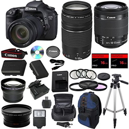 <b>This Bundle Includes:</b> <br /> <b>Canon 7D Digital SLR Camera Body</b> <br /> <b>Canon 18-55mm IS STM Standard Zoom Lens</b> <br /> <b>Canon 75-300mm III Zoom Lens</b> <br /> <b>2x Telephoto Auxiliary Lens</b> <br /> <b>.43x Wide Angle Lens</b> <br /> <b>2pcs 16GB Class 10 Memory Cards</b> <br /> <b>High Speed Card Reader</b> <br /> <b>3pc Deluxe Filter Kit (UV + CPL + FLD) </b> <br /> <b>4pc Macro Lens Kit (+1, +2, +4, +10) </b> <br /> <b>Digital Flash</b> <br /> <b>Extra Replacement Battery Charger</b> <br /> <b>Extra High Capacity Replacement Battery</b> <br /> <b>Deluxe Camera Backpack</b> <br /> <b>Camera Carrying Case</b> <br /> <b>58" Professional Size Tripod</b> <br />