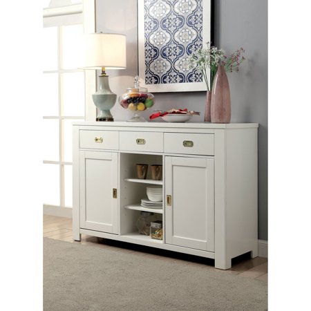 <ul> <li>Dimensions: 56W x 19D x 38H in.</li> <li>Made of solid wood, veneer</li> <li>Creamy white finish</li> <li>2 cabinets, 3 drawers, 3 shelves</li> <li>Metal hardware</li> </ul>
