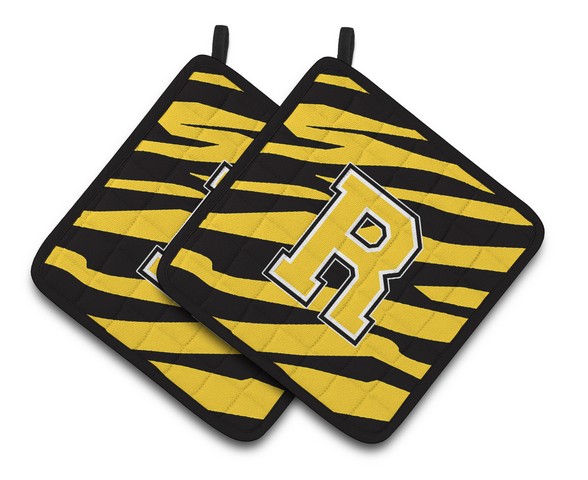 Carolines Treasures CJ1026-RPTHD Monogram Initial R Tiger Stripe - Black Gold Pair of Pot Holders, 7.5 x 3 x 7.5 in.