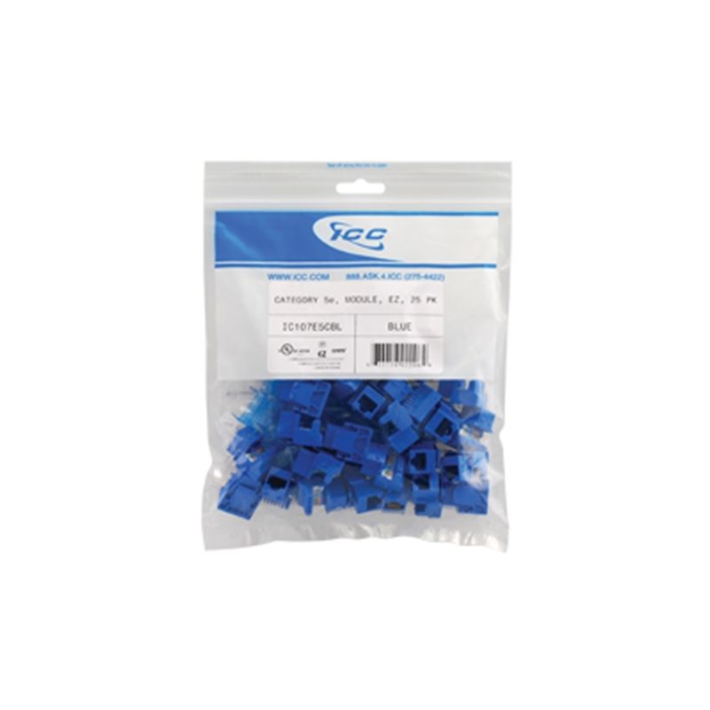 The 25-pack EZ Category 5e modular jacks RJ-45 keystone jacks are 8-position 8-conductor 8P8C and are packaged in bags with a reseal able strip allowing the bags to be reused multiple times preventing loss or mixing of colors or types of modular jacks. The bags have a clear lower area allowing for easy part identification.Features. CAT 5e rated connectors provide excellent performance for data networks requiring maximum speed and bandwidth.. PCB technology provides maximum performance and superior signal quality.. Enhanced crosstalk cancellation reduces return loss and improves performance by rejecting noise and unwanted signals.. Engineered to provide 110 IDC termination reducing installation time.. One piece termination cap allows for a quick and easy termination.. Includes an integrated TIA-568AB color wiring diagram.. Backwards compatible to all lower rated category components.. Compatible with all IC107 faceplates inserts surface mount boxes and blank patch panels.. Compatible with all IC108 furniture faceplates bezels and surface mount boxes.. Used with ICC Category 5e ICPCSC and ICPCSJ series patch cords and 110 punch down tool ICACSPDT00.. 25 modules packaged in packaging bag with 25 termination caps packaged in a separated bag and included in packaging bag.. Exceeds ANSITIA-568-C requirements for permanent channel link and component performances.. UL 1863 compliant.. Color - Blue.