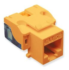 The 25-pack EZ Category 5e modular jacks RJ-45 keystone jacks are 8-position 8-conductor 8P8C and are packaged in bags with a reseal able strip allowing the bags to be reused multiple times preventing loss or mixing of colors or types of modular jacks. The bags have a clear lower area allowing for easy part identification.Features. CAT 5e rated connectors provide excellent performance for data networks requiring maximum speed and bandwidth.. PCB technology provides maximum performance and superior signal quality.. Enhanced crosstalk cancellation reduces return loss and improves performance by rejecting noise and unwanted signals.. Engineered to provide 110 IDC termination reducing installation time.. One piece termination cap allows for a quick and easy termination.. Includes an integrated TIA-568AB color wiring diagram.. Backwards compatible to all lower rated category components.. Compatible with all IC107 faceplates inserts surface mount boxes and blank patch panels.. Compatible with all IC108 furniture faceplates bezels and surface mount boxes.. Used with ICC Category 5e ICPCSC and ICPCSJ series patch cords and 110 punch down tool ICACSPDT00.. 25 modules packaged in packaging bag with 25 termination caps packaged in a separated bag and included in packaging bag.. Exceeds ANSITIA-568-C requirements for permanent channel link and component performances.. UL 1863 compliant.. Color - Orange.