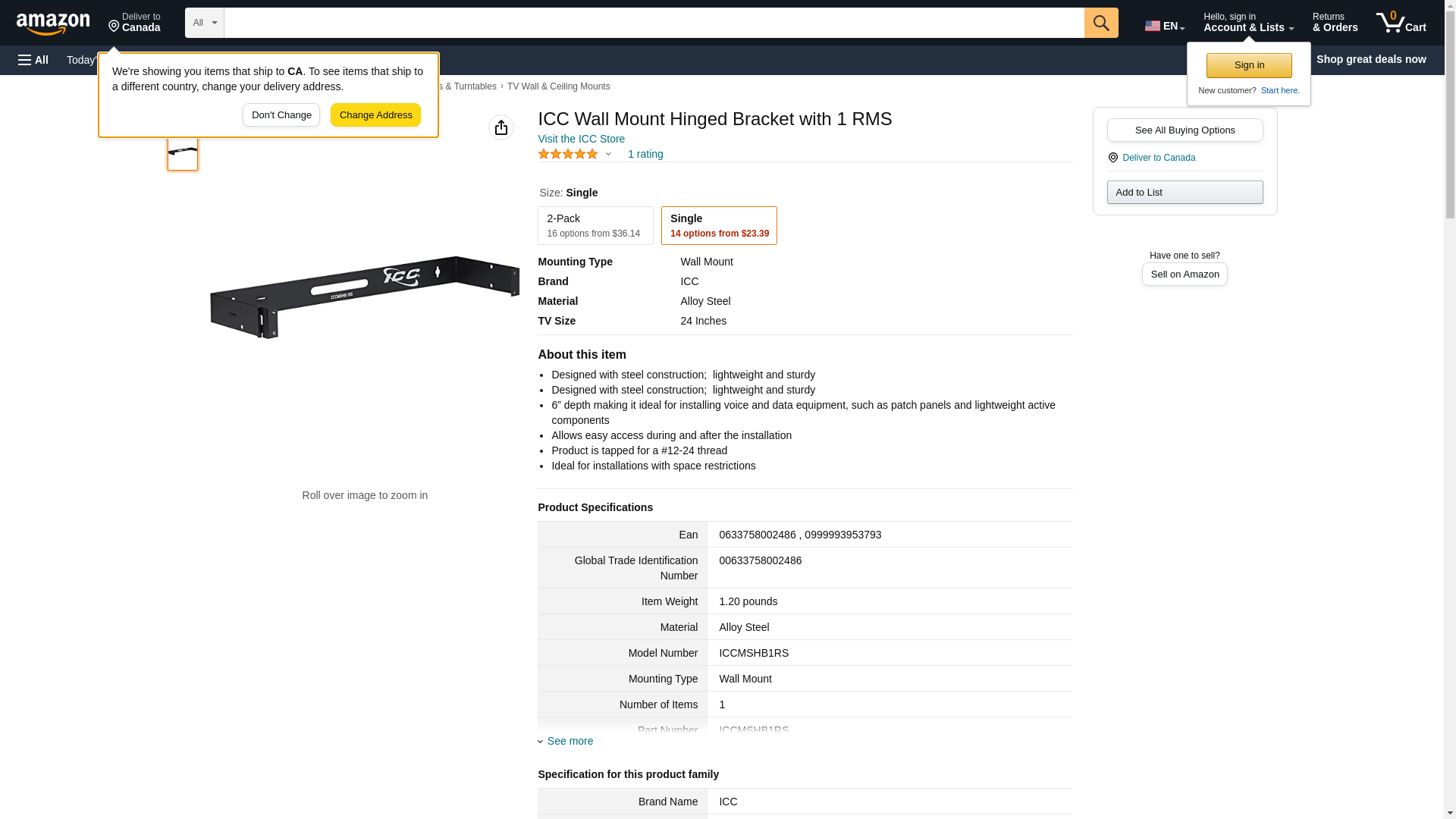 ICC ICCMSHB1RS Hinged Wall Mount Bracket 1 75 (-MSHB1RS).