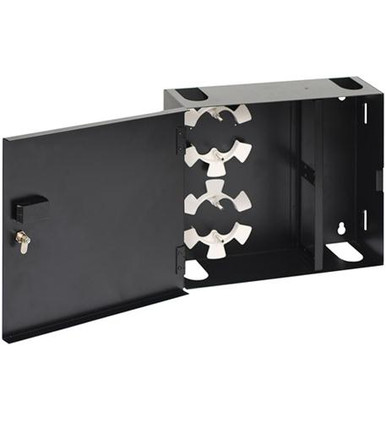 <p>ICC’s 4-Panel wall mount fiber optic enclosure is designed to provide a distribution point to feed a high capacity of fiber optic cables to other closets or zones. The enclosure can be mounted onto walls and in remote indoor locations. It can hold a total of four LGX compatible products; such as adapter panels and MPO cassettes. It can support patching for up to 96 LC, 48 SC or 24 ST fiber optic connections. The enclosure has a swing-out door with a padded lock and key for security. The door also comes with a wiring label for system administration. There are openings on the top and bottom for cable to enter and exit. ICC’s wall mount enclosure provides a safe and clean environment for fiber. ICC’s wall mount fiber enclosure can hold up to one 12 fiber splice tray. It is made with 18 gauge steel, black power-coated, and meets and exceeds all TIA-568-C.3 requirements.</p><p><strong>Features</strong></p><ul><li>Top and bottom cable entry.</li><li>Provides easy access to manage fiber optic cable.</li><li>Made of cold-rolled steel.</li><li>Folded edge to increase strength.</li><li>LGX compatible.</li><li>Holds 4 Fiber Optic Adapter Panels or MPO Cassette</li><li>Accepts 3 Splice Trays.</li><li>Cable management spools and rubber grommets come pre-installed into the enclosure.</li></ul><p><strong>Specifications</strong></p><p><strong>Material:<br /></strong>Enclosure: 18 GA CRS<br /> Adapter Bulkhead: 16 GA CRS<br /> Surface Finish: Black Powder Coating</p>