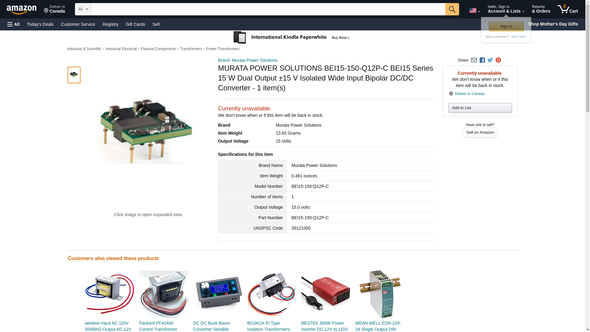 MURATA POWER SOLUTIONS BEI15-150-Q12P-C BEI15 Series 15 W Dual Output ±15 V Isolated Wide Input Bipolar DC/DC Converter - 1 item(s)
