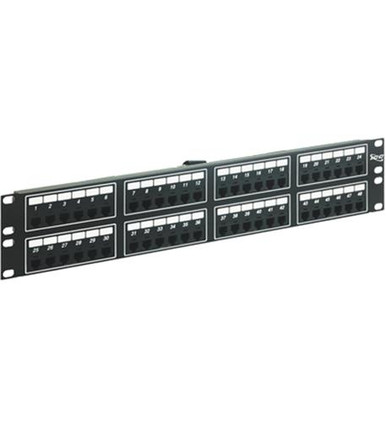 <p >48-port 8P2C female Telco 2 rack mount space (RMS) patch panels consisting of a 2-wire RJ-45 USOC wiring scheme is ideal for KSU or PBX phone systems. The active pins are pin #4 and #5; patch panel connects to 48 ports RJ-45 patch cords on the front and link phone system with 50-pin Telco connectors on the back. Each 50-pin female Telco connector comes with hook and loop tie that is seated in a socket to secure 25-pair cable for either 90 degrees or 180 degrees cable exits. Each patch panel also features front write-on labeling area for port identification.</p><p ><strong>Features</strong></p><ul><li>Rack mounted 8-position 2-conductor (RJ-45).</li><li>Telco patch panel provides voice connectivity applications.</li><li>Integrated with two female 50-pin Telco connectors.</li><li>Designed to fit all standard 19″ racks or cabinets.</li><li>2 rack mount spaces (RMS).</li></ul><p ><strong>Specifications</strong></p><p ><strong>Material:</strong><br /> 48 Port Patch Panel: 16 GA CRS<br /> Jack Housing: ABS, UL 94V-0<br /> Spring Wire: Square Spring Wire, Tempered Phosphor Bronze<br /> Gold Rating: 50 micro inch of Gold over 100 micro-inches of Nickel<br /> Surface Finish: Black Powder Coat</p>