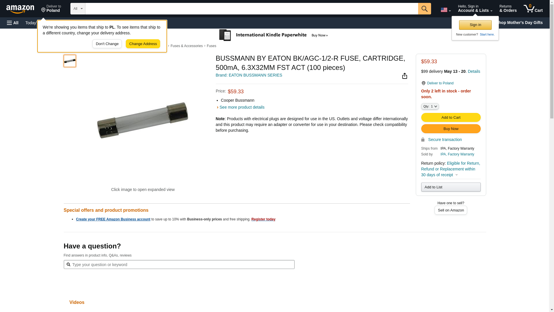 BUSSMANN BY EATON BK/AGC-1/2-R FUSE, CARTRIDGE, 500mA, 6.3X32MM FST ACT (5 pieces)