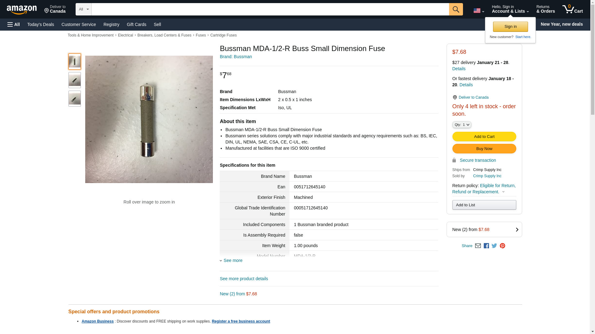 - Bussman MDA-1/2-R Buss Small Dimension Fuse