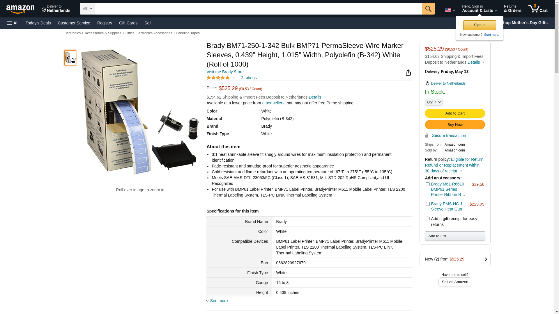 Brady PermaSleeve® Wire marker sleeve in white color is made from heat-shrink polyolefin and has matte finish. It has a shrink ratio of 3:1. It measures 0.439 Inch x 1.015 Inch. Non-adhesive sleeve fits securely around wires for maximum insulation protection and permanent identification. Self-extinguishing sleeve is compatible with BMP71 printers, wire and cable marking, panel identification and voice/data identification. It is compatible with wire of size 0.094 - 0.215 Inch Dia, 16-8 AWG. One-sided printable sleeve is UL listed, RoHS compliant and meets SAE/MIL standards.<br /> BMP«71 Series PermaSleeve« Heat Shrink Polyolefin Shrink Tubing - White. Brand Name: Brady«. Sub Brand: BMP«71 Series PermaSleeve«. Type: Heat Shrink Tubing. Special Features: Excellent Cold-Weather Performance, Heat-Shrinkable, Self-Extinguishing. Application: Cable & Wire Marking, Panel Labeling. Standard: ASTM D 2671, ASTM E 162, ASTM E 662, ASTM G 155, MIL-STD-202, SAE-AMS-DTL-23053, SAE-AS-81531, UL Recognized. Color: White. Material: Brady B-342 Heat Shrink Polyolefin. Height: 0.439 IN. Width: 1 IN. Diameter: 0.25 in Diameter as Supplied. Temperature Range: -94 to 267 DEG F. Printer Type: BMP«71 Label Printer. Labels per Package: 1000. Shrink Ratio: 3:1. Wire Size: 16 AWG to 8 AWG (0.094 in to 0.215 in). Number of Printable Sides: Single-Side Printable. Print Method: Thermal Transfer. Suggested Ribbon Series: R4300, R4502S, R5000, R6600, R6700. Resistance Properties: Chemical-Resistant, Corrosion-Resistant, Humidity-Resistant, Smear-Resistant, UV-Resistant, Weather-Resistant. Label/Media Format: Bulk Roll. Alternate Catalog Number: 115016.