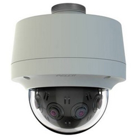 The gray Optera IMM Series 12MP Outdoor Panoramic Pendant Dome Camera from Pelco is a solution that combines four 3MP imagers to provide a 12MP 180° panoramic view. It integrates video across all sensors in the camera, presenting a seamless user experience from setup to viewing. It also enables you to zoom in for detail within multiple intuitive immersive views from a VMS (Video Management System). The camera comes in a compact pendant enclosure with a clear bubble lower dome. It features a robust metal tamper-resistant design with an IK10 impact rating for vandal resistance. The camera utilizes SureVision 2.0 technology designed to consistently and simultaneously delivers low-light performance and true WDR (Wide Dynamic Range). With superior WDR, anti-bloom technologies, 3D noise filtering, and advanced tone mapping, SureVision 2.0 enables the camera to capture images in challenging lighting conditions. The camera supports multiple streaming in H.264 and MJPEG compression formats and CVBR (Constrained Variable Bit Recording) for efficient encoding to conserve video storage and bandwidth. It provides video footage with a frame rate of up to 12.5 fps at full resolution. This IP camera complies with PoE+ (Power over Ethernet plus), eliminating the need for separate power supplies and cabling and increasing the camera availability through an uninterruptable power supply (UPS). The camera comes with eight Pelco video analytics behaviors applied across a wide field of view. Pelco behaviors include Abandoned Object, Adaptive Motion Detection, Camera Sabotage, Directional Motion, Loitering Detection, Object Counting, Object Removal, and Stopped Vehicle. These behaviors enable operators to focus quickly on events and areas of interest. The IMM Series IP dome camera seamlessly connects to the Pelco VideoXpert and Digita