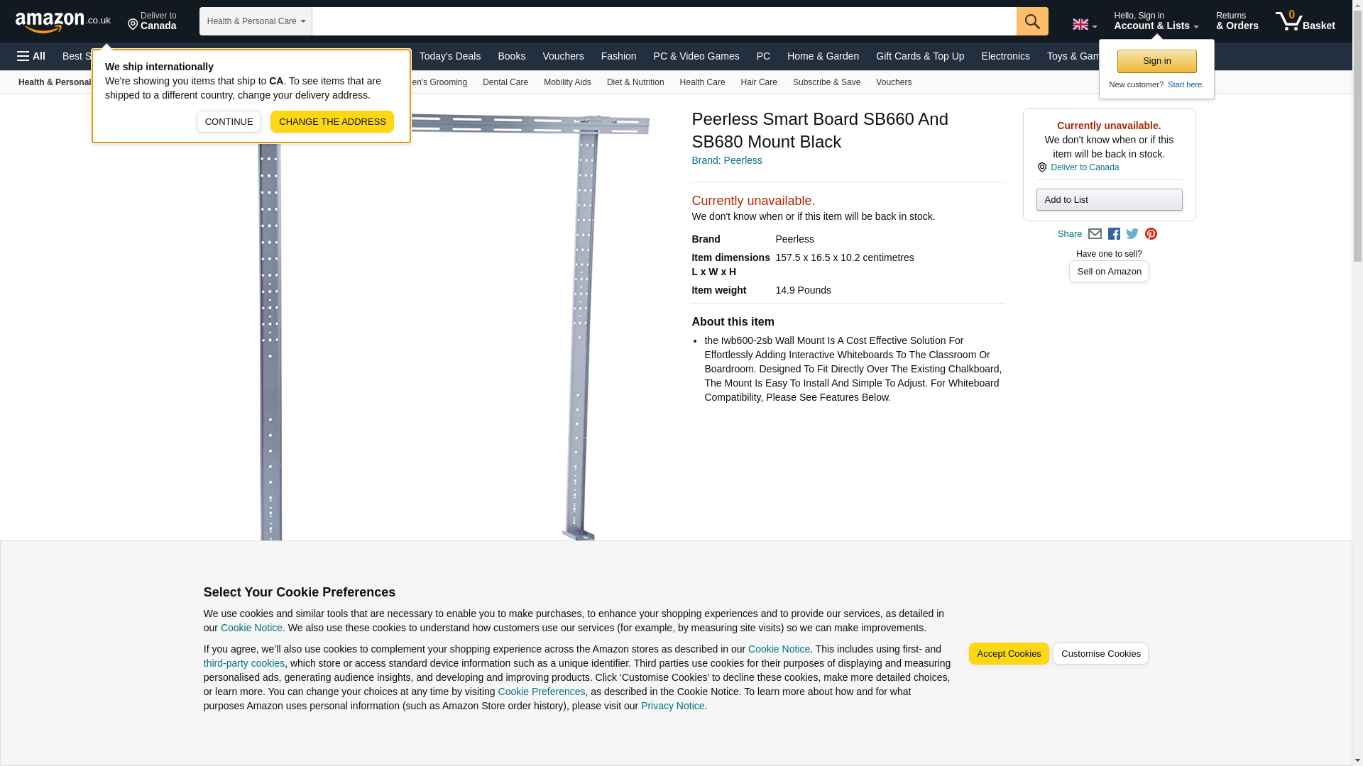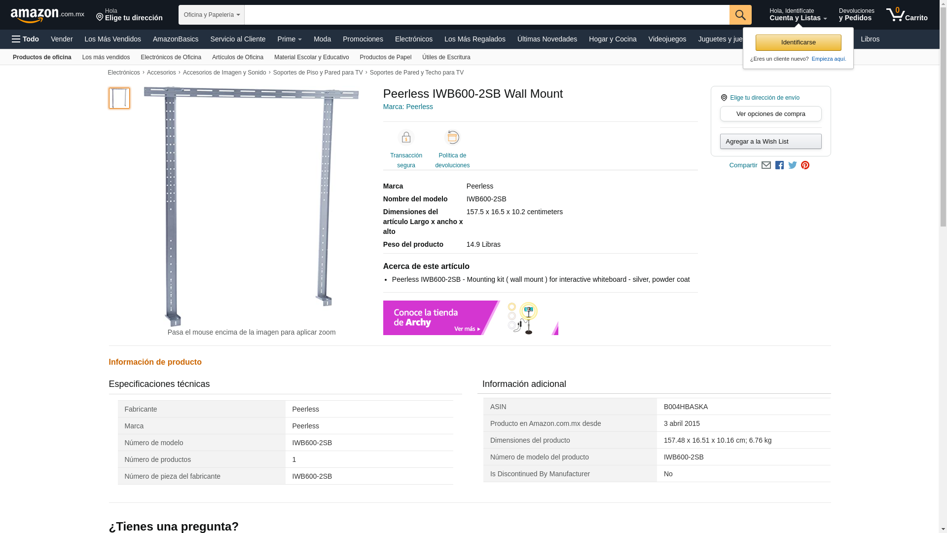 Shipping Depth: 61.8 Shipping Height: 3.5 Shipping Width: 6.5 Master Pack Qty: 0 General Information Manufacturer: Peerless Industries, Inc Manufacturer Part Number: IWB600-2SB Brand Name: Peerless Product Model: IWB600-2SB Product Name: IWB600-2SB Wall Mount Marketing Information: The IWB600-2SB wall mount is a cost effective solution for effortlessly adding interactive whiteboards to the classroom or boardroom. Dedicated to fit directly over the existing chalkboard, the mount is easy to install and simple to adjust. Packaged Quantity: 1 Product Type: Wall Mount Product Information Device Supported: Projector Screen Maximum Load Capacity: 70.00 lb Physical Characteristics Color: Silver VESA Mount Compatible: Yes Height: 59.0 Width: 59.0 Depth: 5.8 Weight (Approximate): 17.50 lb Miscellaneous Package Contents: IWB600-2SB Wall Mount Wall Brackets Vertical Rails Whiteboard Attaching Hardware Compatibility: 64 SMART Board SB660 77 SMART Board SB680 77 Marsh Board PR4050000 63 - 77 Hitachi Starboard DUO 77 Hitachi Starboard DUO 77 Hitachi Starboard TRIO 88 Hitachi Starboard DUO 77 Interwrite DualBoard 1277 64 ActivBoard 164 78 ActivBoard 178 78 ActivBoard 378 PRO 87 ActivBoard 387 PRO 95 ActivBoard 395 PRO Warranty Standard Warranty: 5 Year Limited