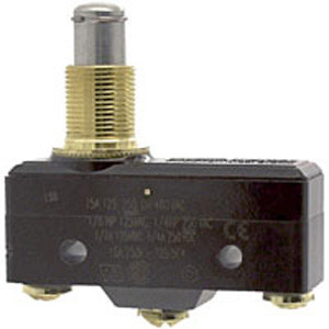 ' Industrial Snap Switch Item, Series BZ, Type of Actuator Overtravel Plunger, 1.94 In. Actuator Length, Contact Form SPDT, Current Rating 15A, Voltage Rating 125/250/480VAC, Terminal Type Screw, Operating Force 9.0 to 13.0 oz., Max. Pretravel 0.015 In., Release Force 4.00 oz., Differential Travel 0.0004 to 0.0020 In., Over Travel 0.219 In., Length 1.94 In., Height 0.95 In., Depth 0.069 In., Mounting Dimension 1.00 In. Centers, Operating Temp. Range -67 Degrees to 185 Degrees F '