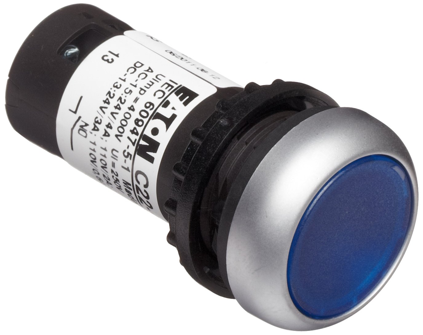 Eaton C22-DRL-B-K10-120 Pushbutton Switch, Illuminated, Flush Mounted, Maintained Operation, Blue LED Color, Silver Bezel Color, SPST-NO Contacts, 120VAC Voltage
