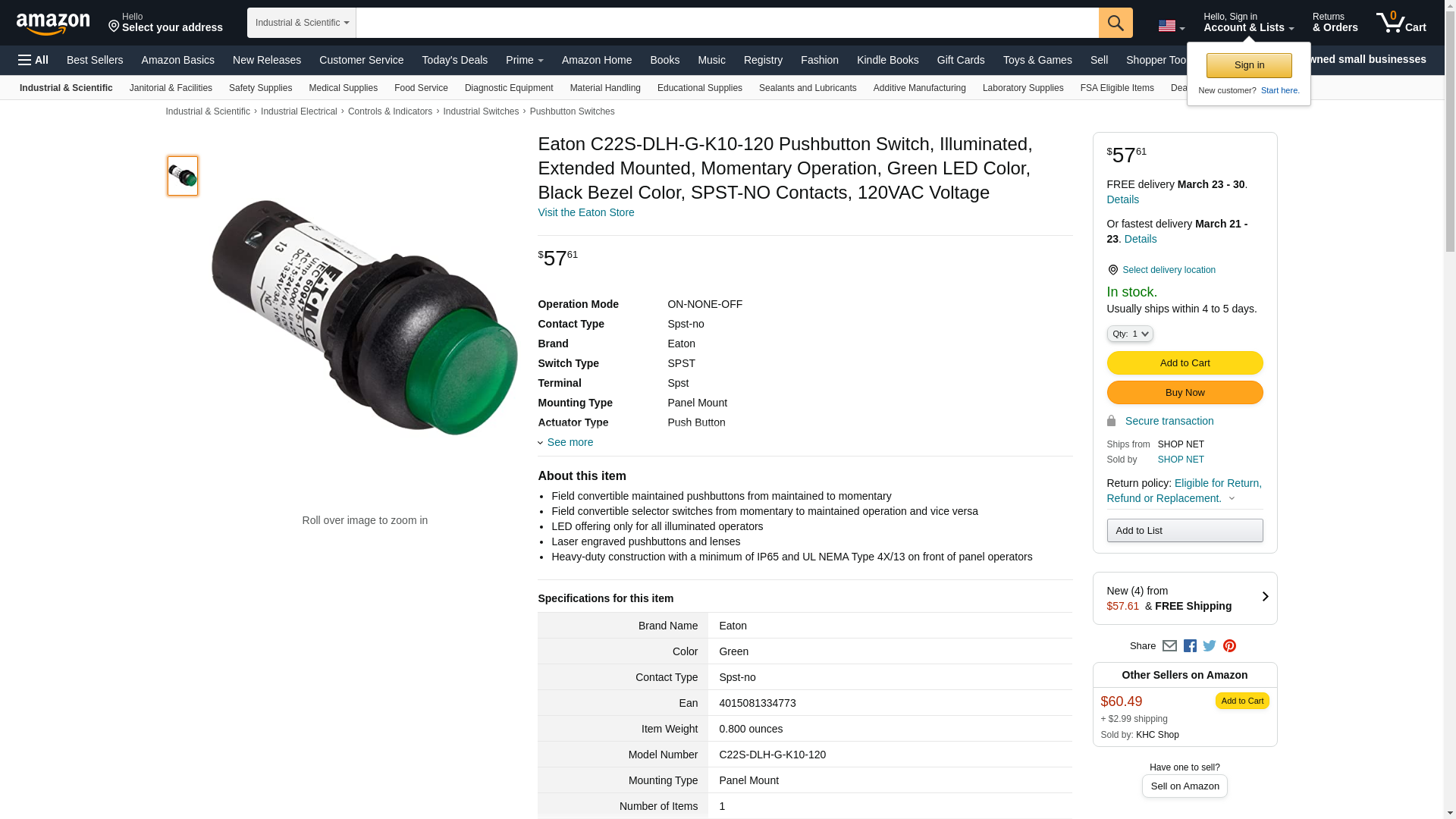 "Eaton / Control Automation C22S-DLH-G-K10-120 Switch, Pushbtn; SPST; 1.5A 230VAC; 120VACLED; 22mm mnt; Grn; Extd."