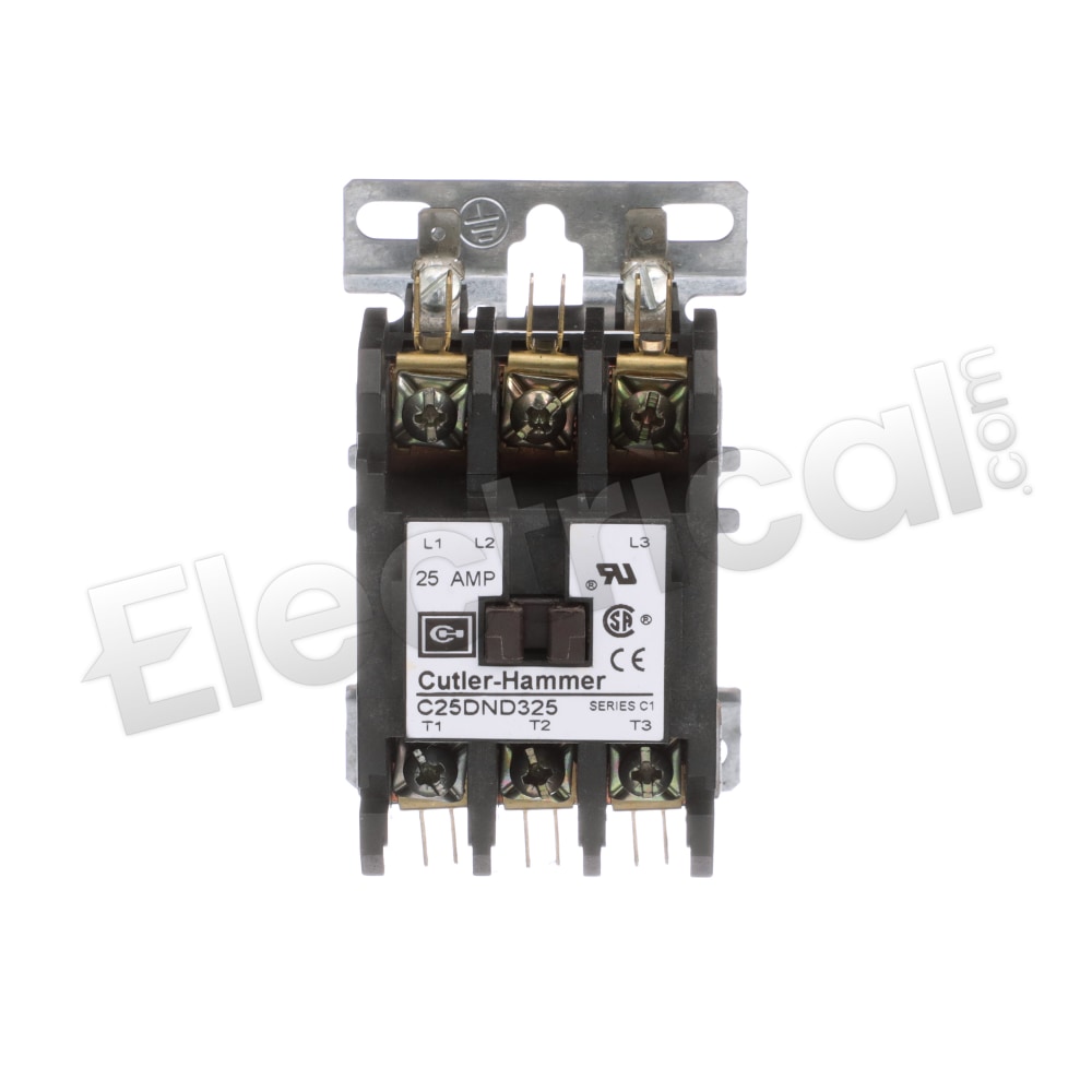 Eaton C25DND325B Definite Purpose Contactor, 50mm, 3 Poles, Screw/Pressure Plate, Quick Connect Side By Side Terminals, 25A Current Rating, 2 Max HP Single Phase at 115V, 7.5 Max HP Three Phase at 230V, 10 Max HP Three Phase at 480V, 208-240VAC Coil Voltage