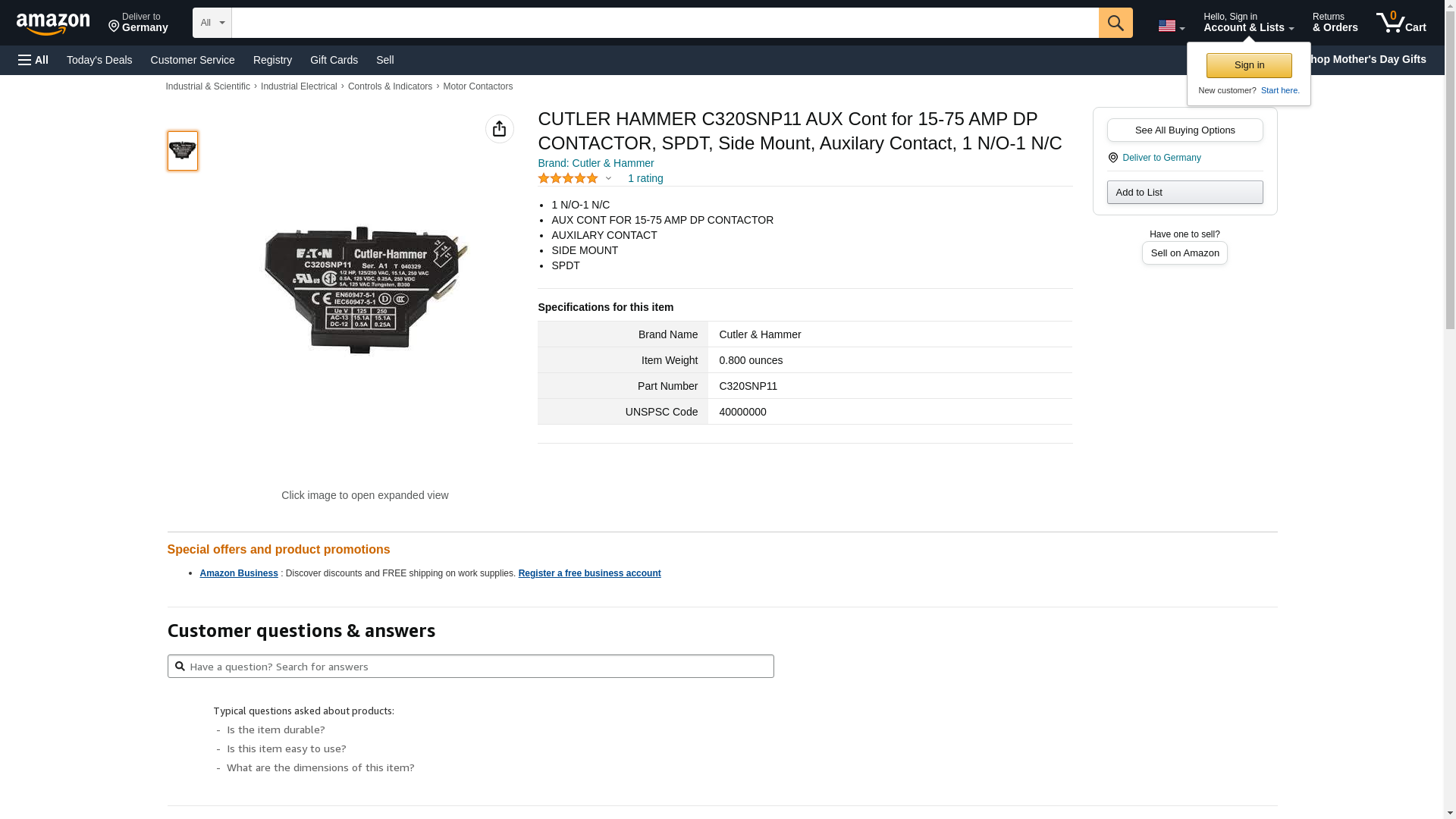 CUTLER HAMMER C320SNP11 AUX Cont for 15-75 AMP DP CONTACTOR, 1 N/O-1 N/C, SPDT, Side Mount, Auxilary Contact