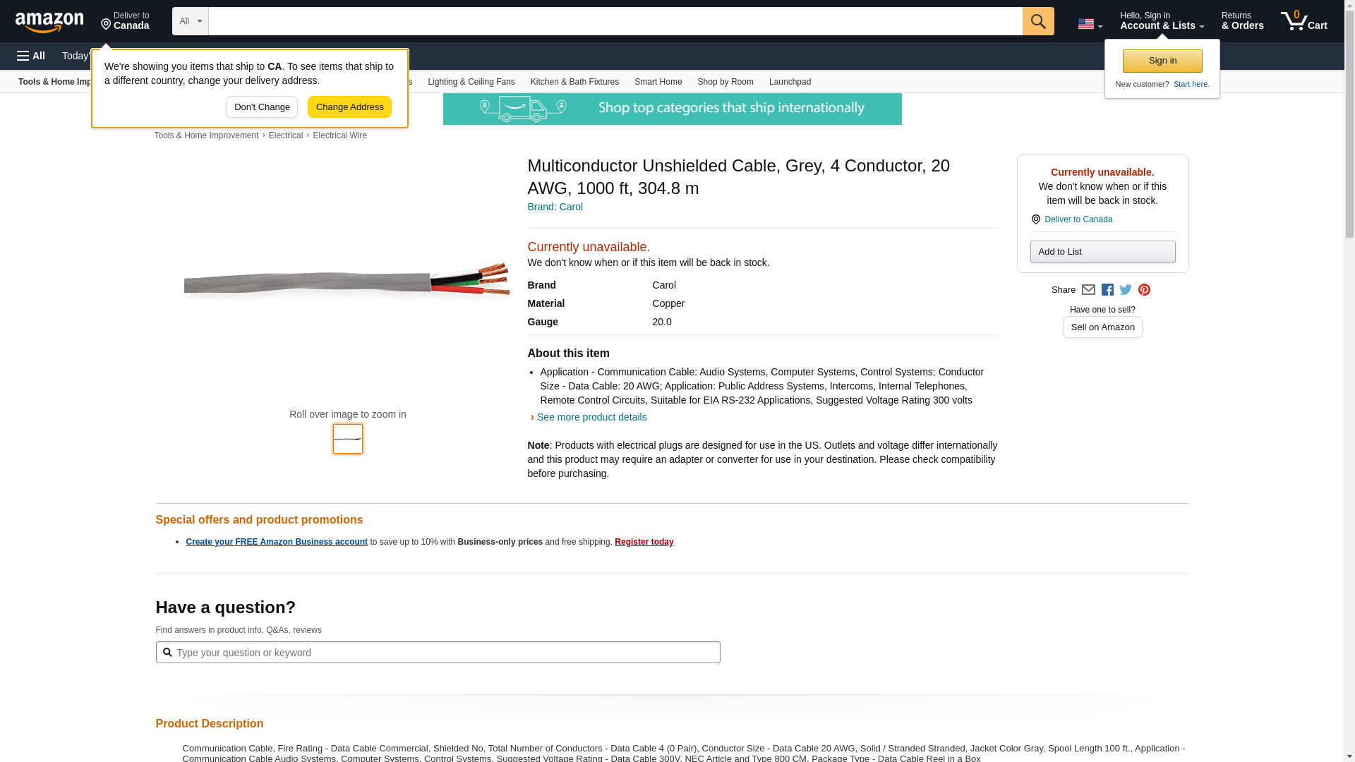 | Feature | <b>Price For:</b> Each<b>Return policy:</b> Item is non-cancelable and non-returnable<b>Order Unit:</b> Spool of\xa01000 <b>Conductor Area CSA:</b>: - <b>Conductor Material:</b>: Tinned Copper <b>Conductor Size AWG:</b>: 20 <b>External Diameter:</b>: 5.97 <b>Jacket Color:</b>: Grey <b>Jacket Material:</b>: PVC <b>No. of Conductors:</b>: 4 <b>No. of Strands x Strand Size:</b>: 7 x 28AWG <b>Reel Length (Imperial):</b>: 1000 <b>Reel Length (Metric):</b>: 304.8 |