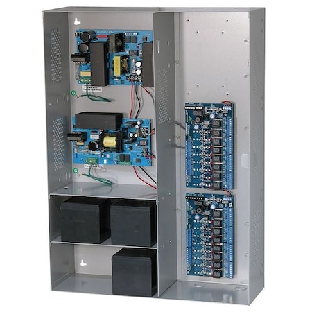 Altronix MAXIMAL75D 2 Power Supply/Charger with Access power controllers - 16 PTC Class 2 power limited outputs, 8 outputs are 12VDC @ 9.5 amp and 8 outputs are 24VDC @ 9.7 amp, outputs are individually selectable for Fail-Safe or Fail-Secure operation, fire alarm disconnect is selectable by output, AC & battery monitoring, encl. 26"H x 19"W x 6.25"D, 115VAC input, Accommodates up to 4 - 12VDC/12AH batteries, UL Listed (UL294), cUL Listed, CSFM Approved.