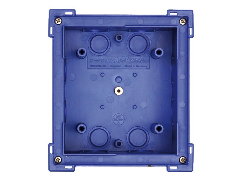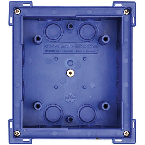 MOBOTIX MX-OPT-Box-1-EXT-IN Suitable for: 1 module, outdoors - The blue housing is firmly connected to the subsurface or brick work. It can also be used to ensure easy installation in cavities: Drill opening, position housing and screw tightly in place; the retaining wings, which automatically swing out, secure the housing, while the plastic bars at the edge of the housing prevent it from sliding into the cavity. - Required flushmounting opening: 117 x 129 mm (width x height) - Permissible wall thickness for cavity installation: 7 to 27 mm