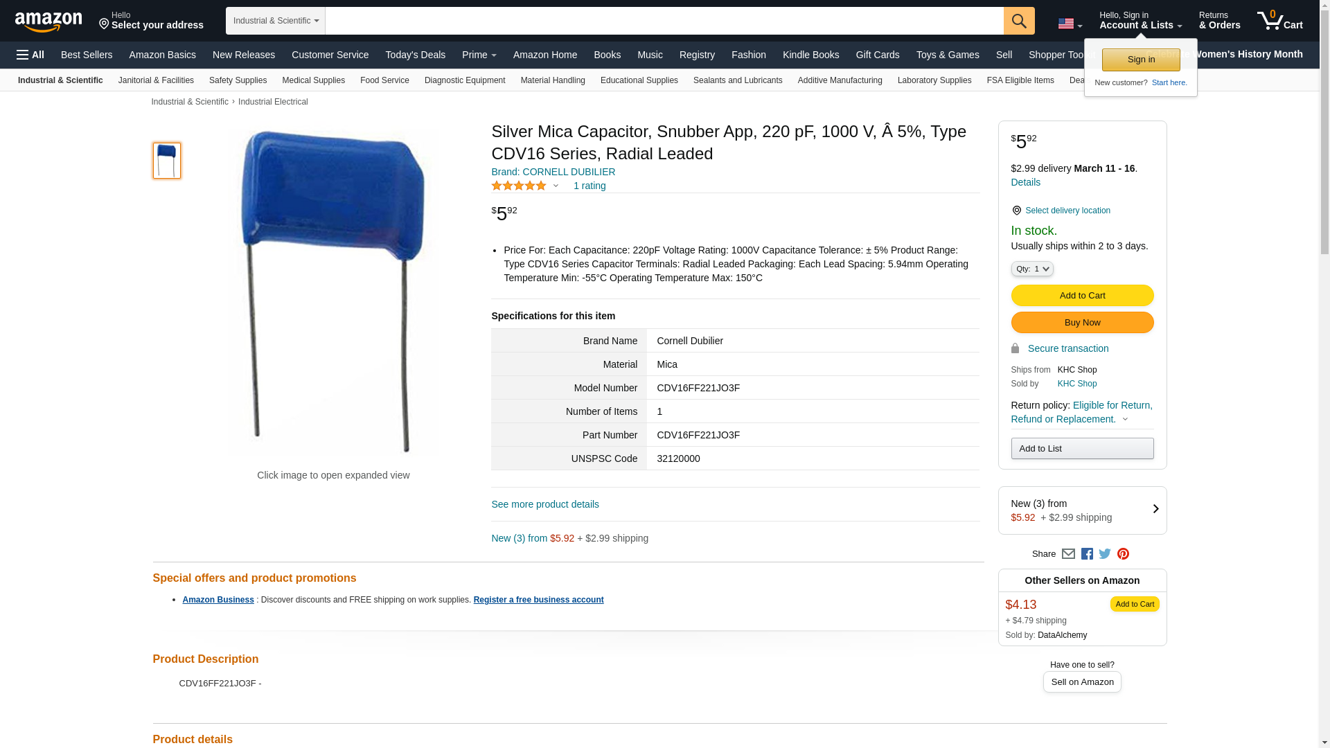 | Onlinecomponents.com | CDV16FF221JO3F | 1 | 1 | 1 @ $0.97, 2 @ $0.90, 26 @ $0.85, 101 @ $0.79, 201 @ $0.72, 501 @ $0.59, 1001 @ $0.56 |