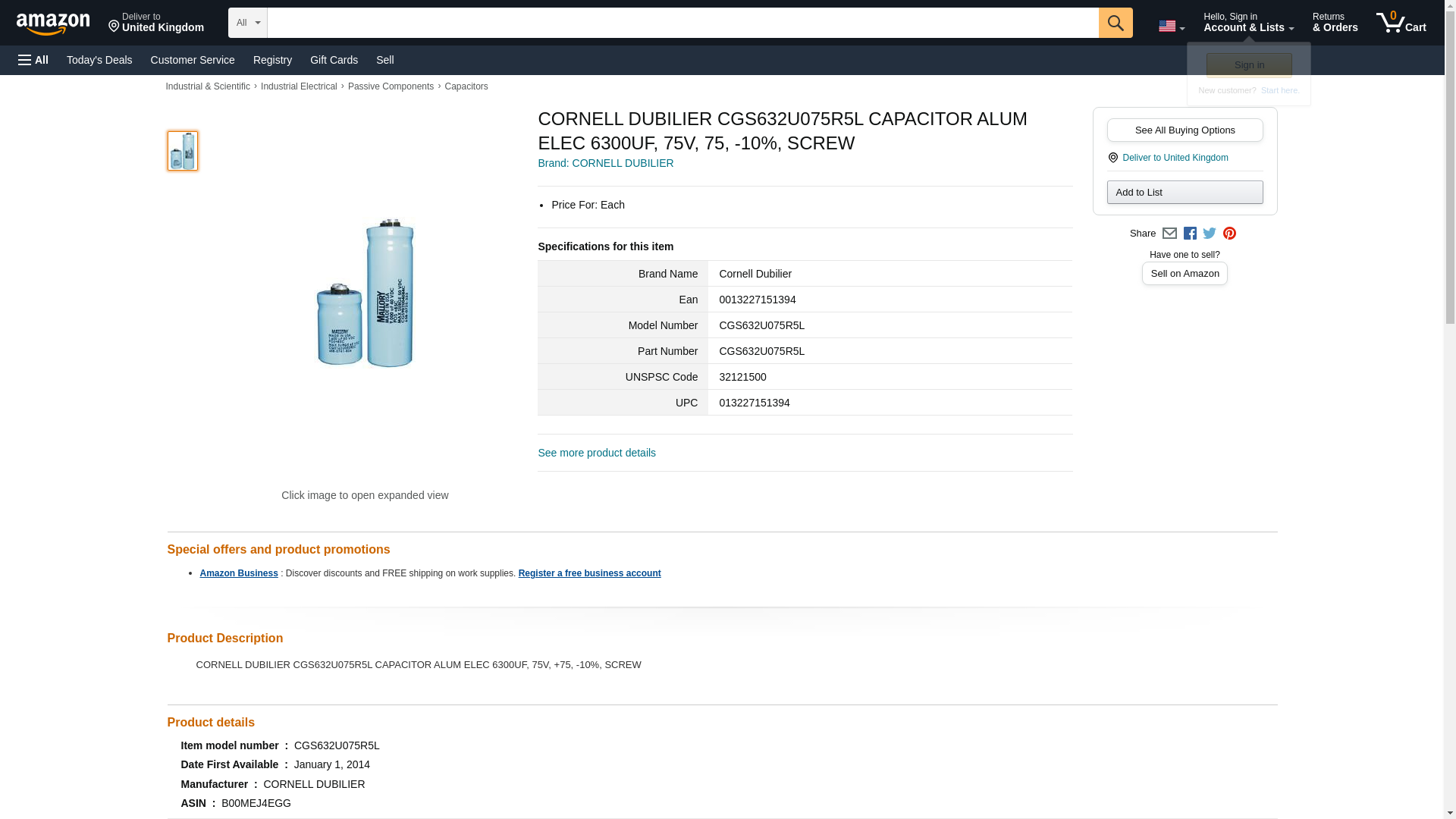 CORNELL DUBILIER CGS632U075R5L Capacitor Alum ELEC 6300UF, 75V, 75, -10%, Screw