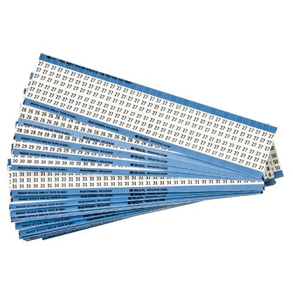 B-500 Repositionable Vinyl Cloth wire marker combination packs from Brady allow for quick, durable, on-the-spot wire marking. Each pack contains one card per character with all legends identical on the individual card Brady B-500 Repositionable Vinyl Cloth holds tightly to surfaces but allows item to be repositioned with ease if necessary Excellent flexibility for wrapping around curved surfaces Withstands moderate heat, oil, water and dirt