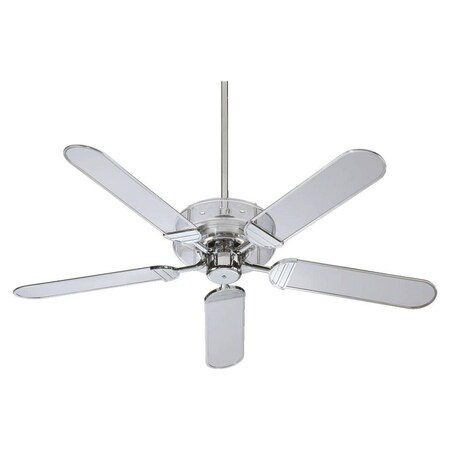The Quorum 400525-14 Prizzm collection 52" indoor ceiling fan (with pull chain control) in Chrome brings Contemporary style. This fan includes Five Reversible Chrome / Clear Acrylic Blades and the hanging height is 15.75". The voltage is 120 volts. Additional Information: Control - Three-speed pull chain with manual reversing switch on motor; Downrod - Includes 6" (1/2" Exterior Diameter) Pole