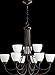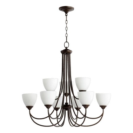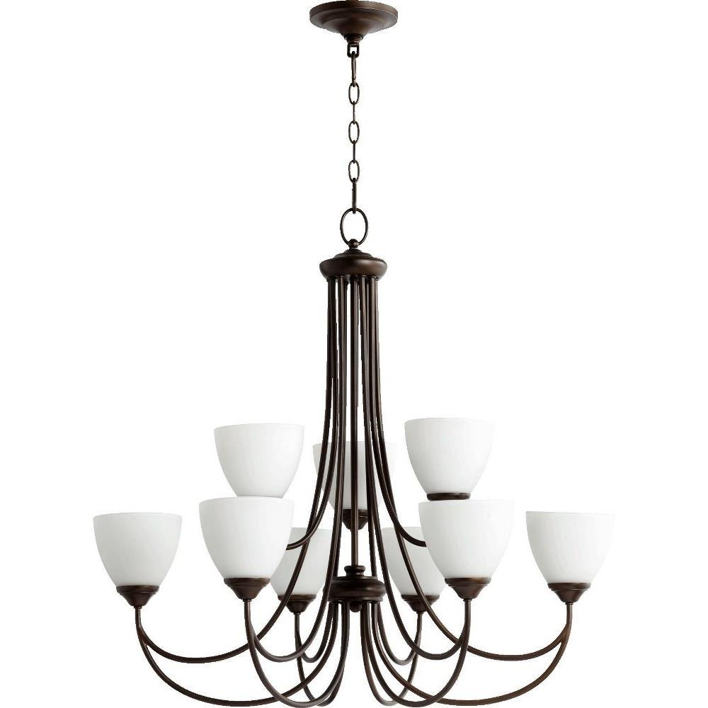 "This Nine Light Up Chandelier is part of the Brooks Collection and has an Oiled Bronze Finish and Satin Opal Glass. It is Dry Rated."