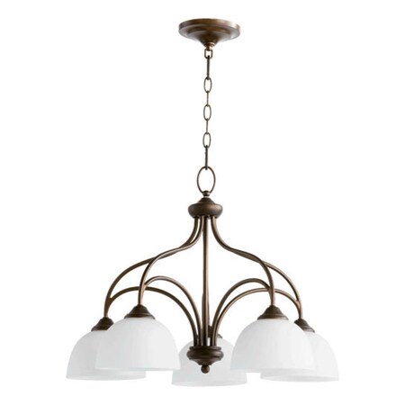 "This Five Light Down Chandelier is part of the Brooks Collection and has an Oiled Bronze Finish and Satin Opal Glass. It is Dry Rated."