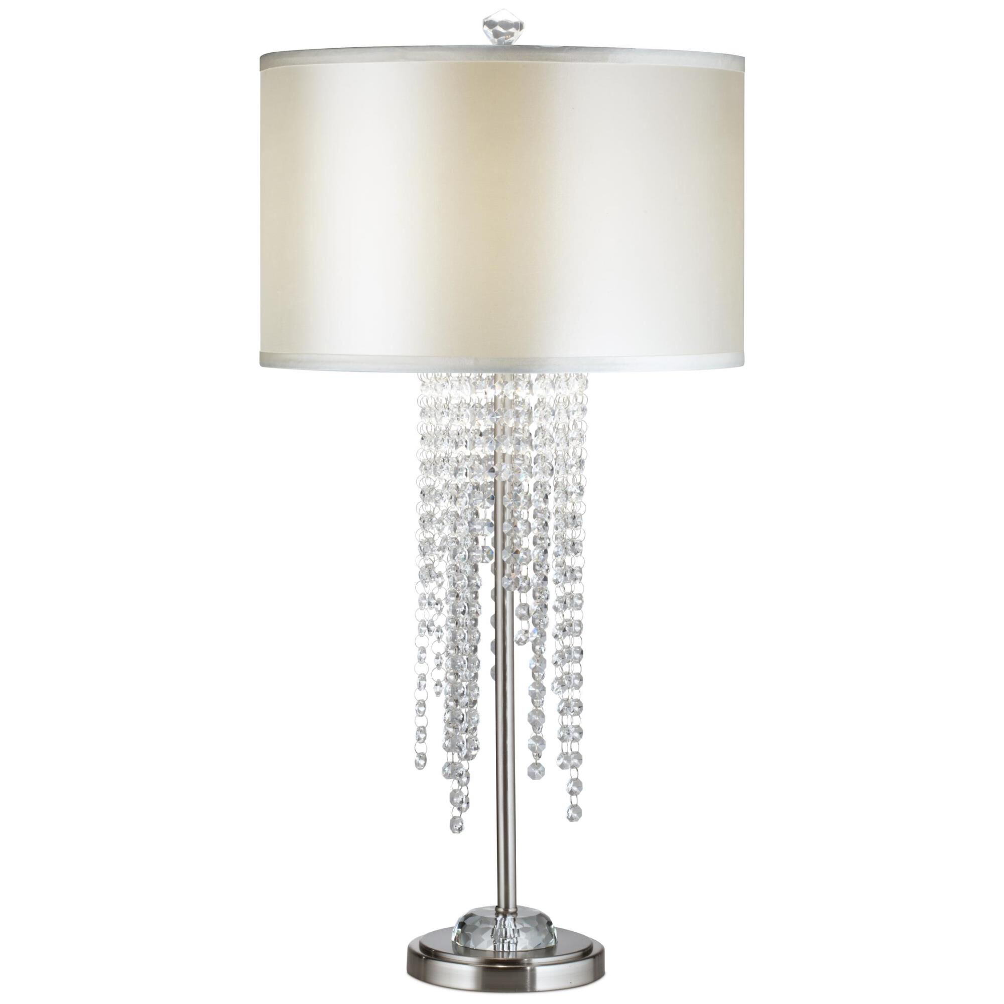 Hanging crystal accents add another dimension of style to this stunning table lamp by Pacific Coast Lighting. The sleek warm silver finish base is embellished with a glass accent. This table lamp is perfect for transitional settings and contemporary rooms. A champagne faux silk drum shade adds a luxurious touch to the entire look.