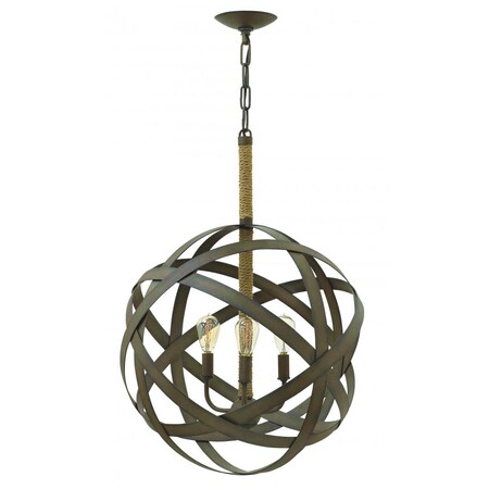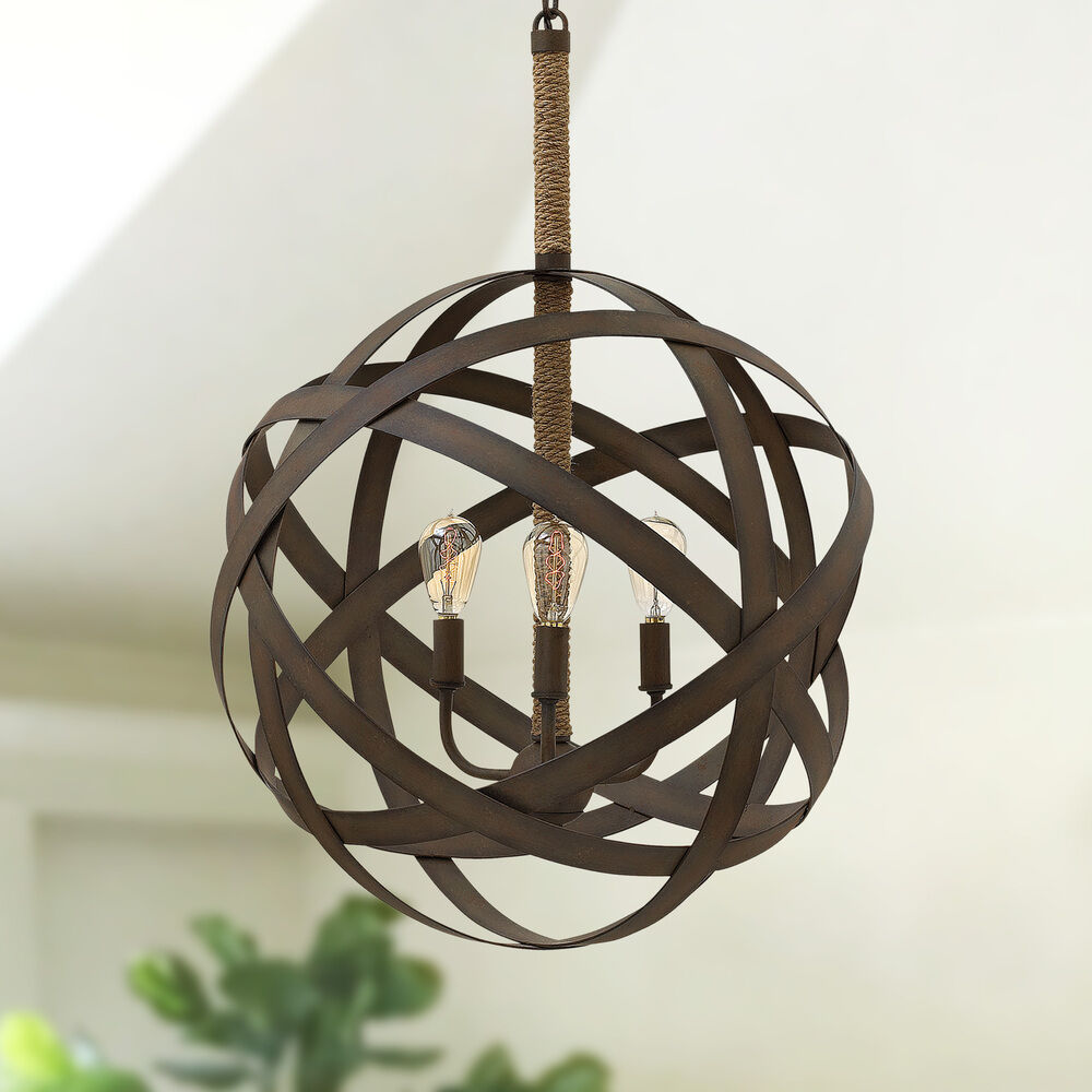 Carson pairs a hint of industrial sophistication and repurposed craftsmanship with its bold overlapping metal ribbons. The hand-crafted pendants in an Iron Rust finish are suspended from an aged rope column for a subtle touch of reclaimed charm.