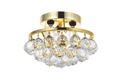 Brimming with sparkle, Corona collection flush mount lamps fill a home with brilliant light. A rounded frame is overflowing with clear crystal balls and faceted prisms. A bejeweled scalloped band at the top is tipped with matching crystal balls to form a gorgeous ?crown? of crystals, from which the design gets its name. Available in a chrome or gold finish that is dazzling in an entryway, bathroom, or hallway.