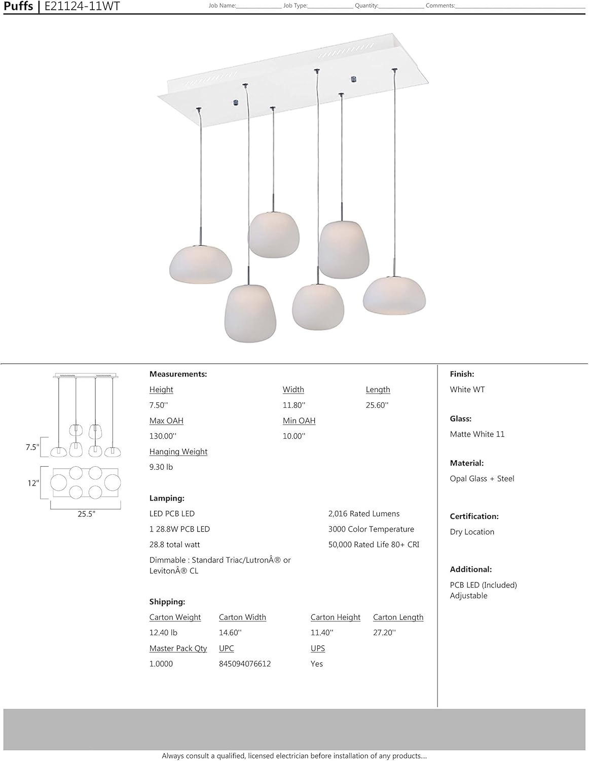 - PUFFS PENDANT LIGHT DIMENSIONS: 7.5" High (130" Max Adjustable Height) x 11.8" Wide x 25.5" Long, Weight: 9.3 LBS, Ceiling Canopy: 8.7" W x 22" Long x 1.66" D