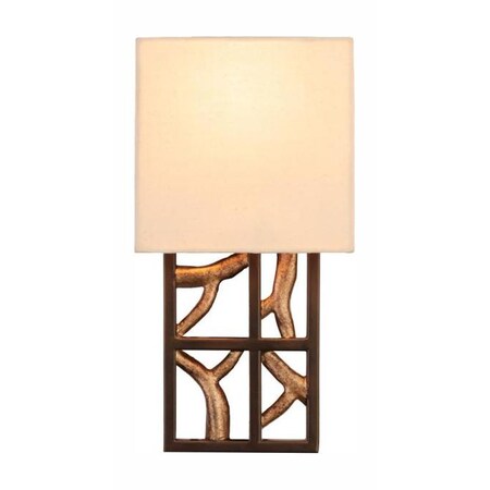 This distinctive, modern, hand-forged iron wall sconce has a linear, trellis-like flat back panel finished in antique bronze. Divided into four sections with each containing a heavier, organic branch-like accent highlighted in gold that gives them a rich, warm glow. This single-light ADA compliant design is completed with a flat, square beige linen panel shade that further enhances its comforting warmth.